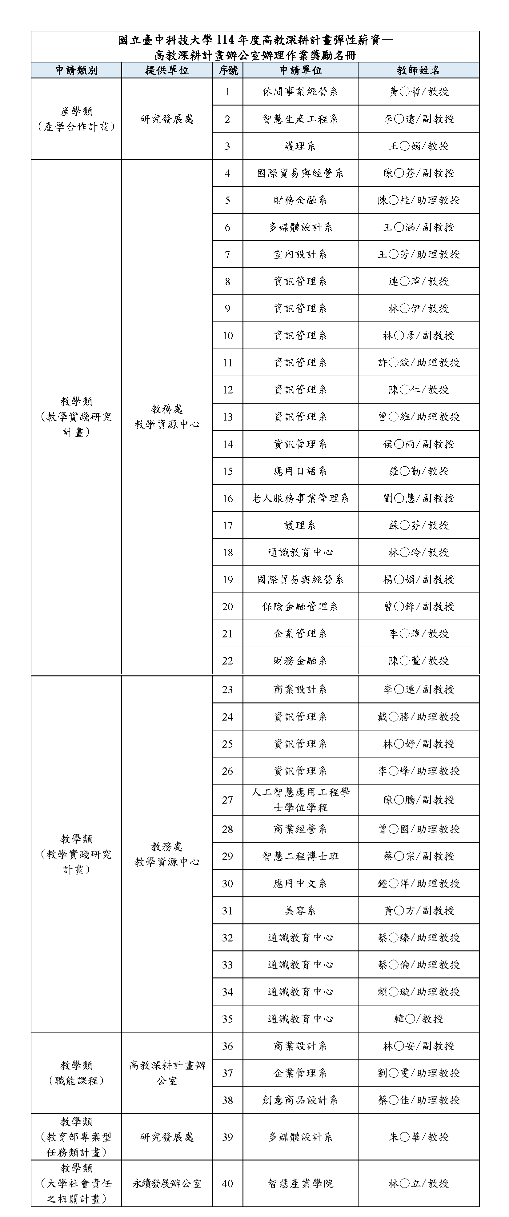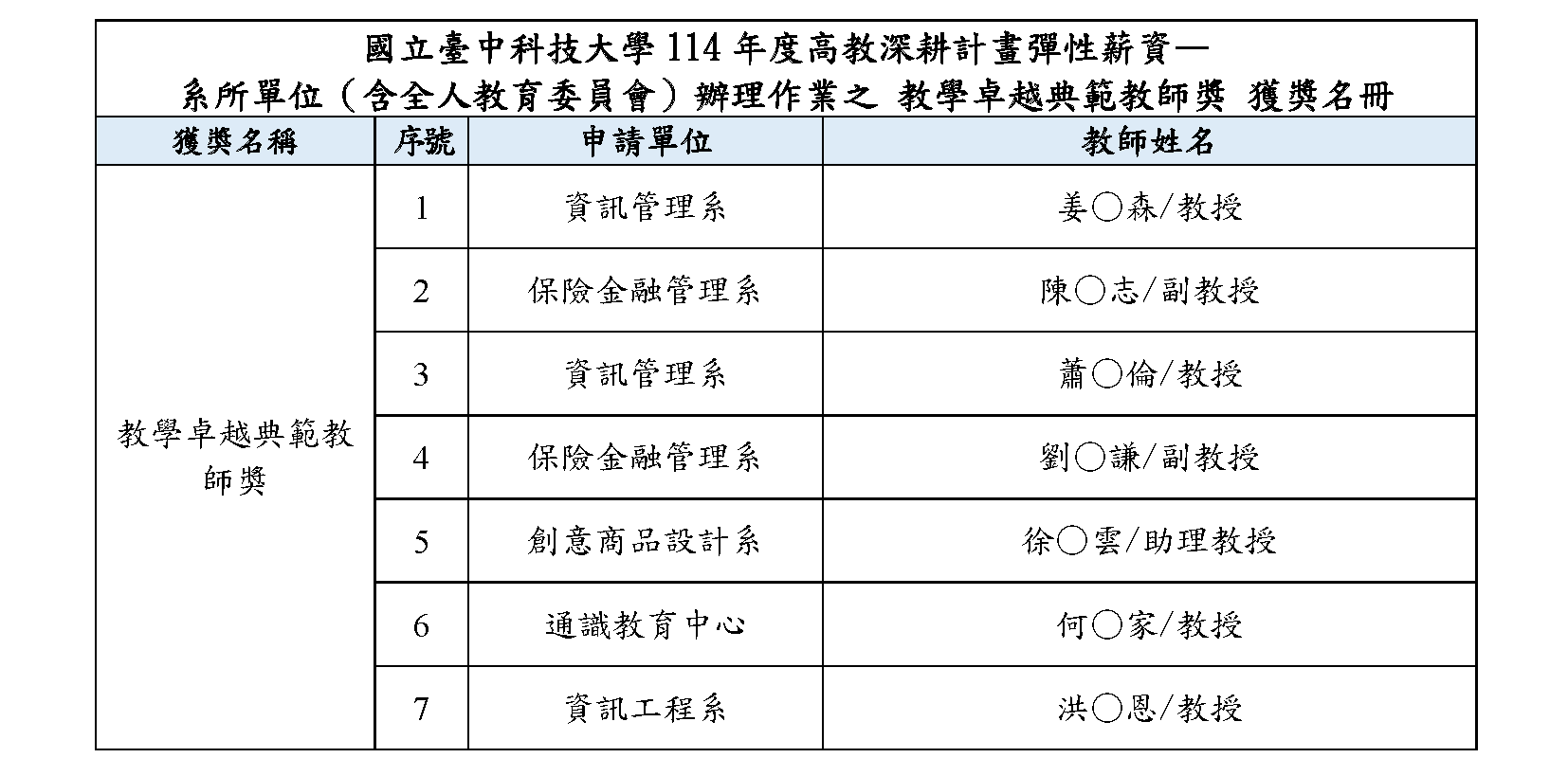 【獲獎名單】國立臺中科技大學114年高教深耕計畫彈性薪資獎勵案